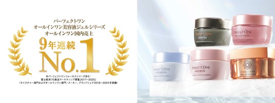 ※1 パーフェクトワンフォーカスシリーズ含む:富士経済「化粧品マーケティング要覧2017~2025」(モイスチャー部門およびオールインワン部門/メーカー、ブランドシェア2016~2024年実績) ※2 TFCO株式会社調べ「最大の顔用保湿ジェルブランド(Largest facial moisturising gel brand)」(パーフェクトワン オールインワン美容液ジェルシリーズ 2023年1月~12月販売実績)