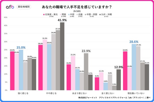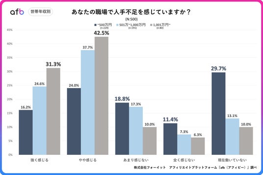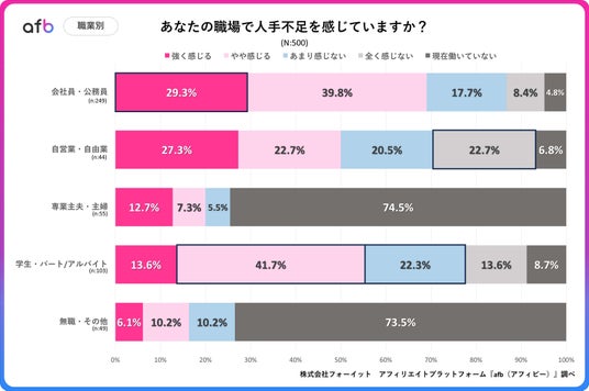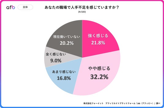 アフィリエイトプラットフォーム「afb(アフィビー)」< https://www.afi-b.com/ >の開発運用をおこなう株式会社フォーイットは、全国の20代~60代までの男女500人を対象に人手不足に関するアンケートを実施し、年代別等の特徴についてまとめました。