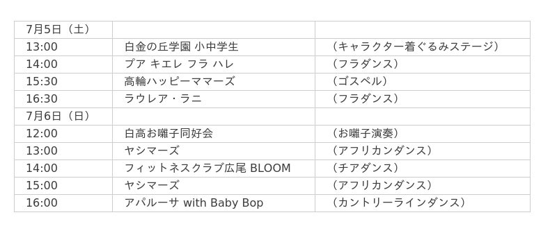 地域の皆さんによる心温まるパフォーマンスが登場します。地元の子どもたちによる元気いっぱいのチアダンス、心をひとつに響かせるゴスペルの歌声、華やかで癒しのフラダンス、日本の伝統を感じる迫力のお囃子、そして笑顔あふれるカントリーダンスなど、多彩な演目が目白押しです。みんなの笑顔とエネルギーに、ぜひ大きな拍手をお願いします。地元ならではのステージをぜひお楽しみください。