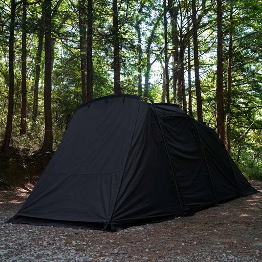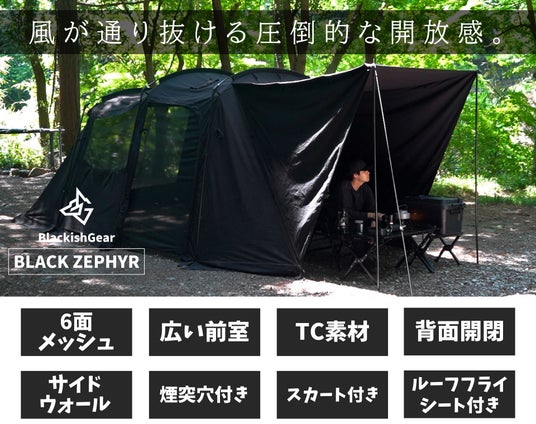 BLACK ZEPHYR(ブラックゼファー)は6面をメッシュ窓にできるトンネル型の2ルームテント。