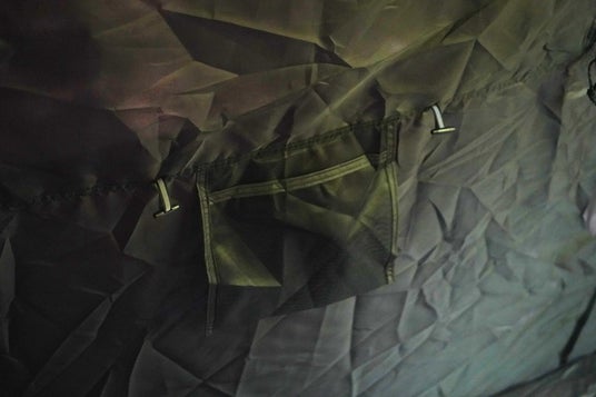 外側には3段ポケット、室内にもメッシュポケットやランタンフックを完備しています。