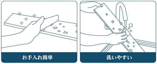 布で拭くだけでなく、水で丸洗いも可能。掃除にかかる手間を最小限に抑え、キッチンをいつでも清潔に保てます。