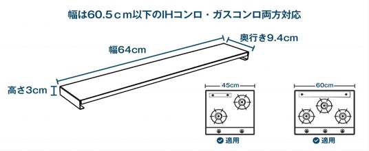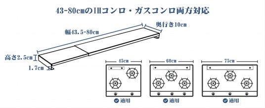 幅は約43~80cmまで伸縮可能、排気口の高さ約2.5cm以下のビルトインガスコンロ・IHクッキングヒーターに対応。料理の邪魔にならない超薄型設計が、毎日の作業をよりスムーズに。