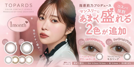 PIA株式会社(本社:東京都品川区 代表取締役:見原 博道)はカラコン支持率No.1(※)指原莉乃さんプロデュースのカラーコンタクトレンズブランド『TOPARDS 1MONTH(トパーズ ワンマンス)』より、「Cream Rose(クリームローズ)」「Mocha Ring(モカリング)」の新色2色を2025年6月13日(金)より各WEB販売店舗にて発売開始いたします。
