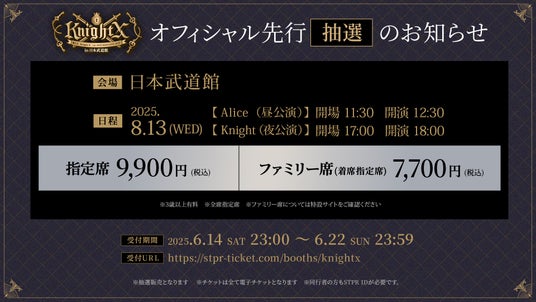 株式会社STPR (本社:東京都渋谷区 代表:柏原真人、以下STPR)は、弊社所属の2.5次元歌い手アイドルグループ「騎士X - Knight X -」(以前のグループ名:Knight A - 騎士A -、以下 騎士X)が、日本武道館にて開催する自身初のワンマンライブについて、2025年6月14日(土)23:00よりオフィシャル先行受付を開始したことをお知らせいたします。