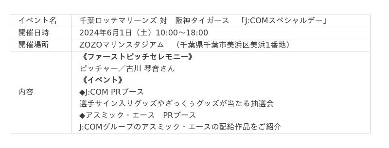 千葉ロッテマリーンズのオフィシャルスポンサーである株式会社ジェイコム千葉(J:COM、所在地:千葉県浦安市、代表取締役社長:千田貞文)は、ZOZOマリンスタジアムで行われるプロ野球セ・パ交流戦「千葉ロッテマリーンズ」対「東京ヤクルトスワローズ」に冠協賛し、「J:COMスペシャルデー」と題して、ファーストピッチセレモニーや各種イベントを2025年6月14日(土)に実施しました。