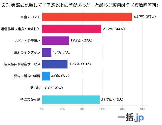 - 「サポートの手厚さ」(13.3%、20人)、「法人特典や独自サービス」(12.7%、19人)といったサポート面や付加価値サービスについても、一定数が予想以上の差を実感していることがうかがえます。