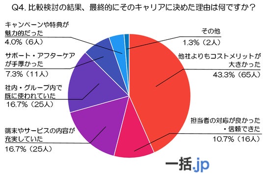 - 最も多かった回答は「他社よりもコストメリットが大きかった」で、全体の43.3%(65人)を占めています。この結果から、法人携帯キャリアの最終決定においてはコストパフォーマンスが圧倒的に重視されていることがわかります。