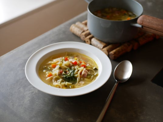 今回は、取りおいた分にスパゲッティを入れて、バジルペーストをちょっと足しました。バジルペーストを足すのは、スープ・ピストゥという南フランスのスープをヒントにしています。パスタは最初から入れてしまうと持ちが悪くなるので、二日目にいれるのがおすすめです。