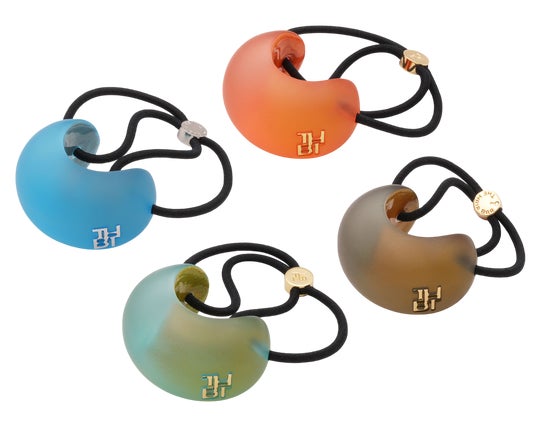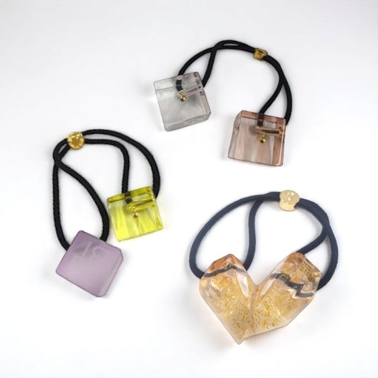中:(左)【THE HAIR BAR TOKYO】 ダブルキューブポニーウィズスタッズ グレーブラウン(上)11,000円 ダブルキューブポニースモール フロステッド ウィズ メタルアイコン ピンクイエロー